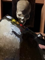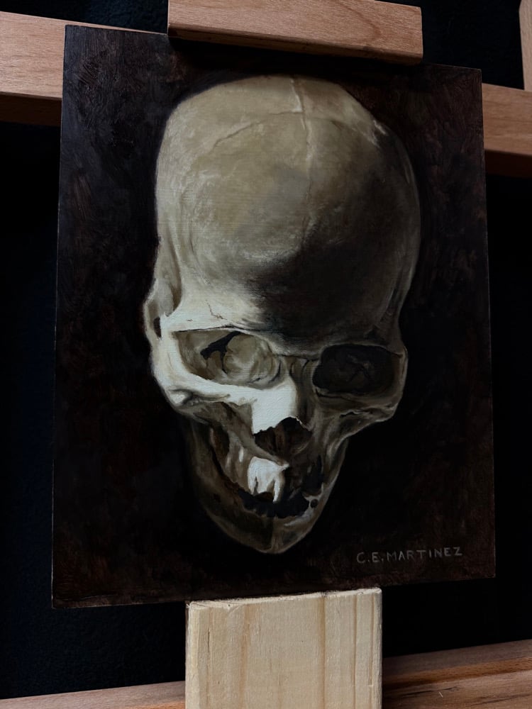 Painted in oil on wood panel, this study of the human skull as Momento Mori subject matter serves as a reminder that we all must go.
